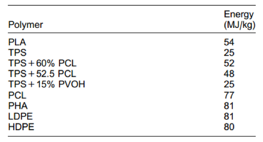 The environmental effects of a product on the environment is determined through a Life Cycle Analysis (LCA). This looks at all of the effects of a product from its production until it has completely decomposed [1]. Biodegradable polymers are better for the environment than plastics in almost every way. They require less use of fossil fuels, produce less waste water, create less air pollution, and cause less damage to natural ecosystem functions. One of the main issues with the production of plastic is the amount of energy required in their production, which leads to Greenhouse gasses being released and global warming. The production of biodegradable polymers has been shown to require significantly less energy than plastics, ranging from 25-54 MJ/Kg of energy compared to 77-81 MJ/Kg for plastics [1] [2] [3].